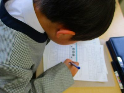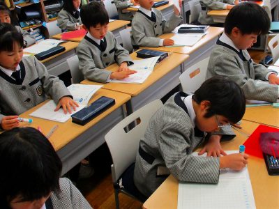 「表とグラフ」を実際に書いてみようと、文教キッズヴァージョンの「好きな給食メニュー」の人数調べをしているところです。