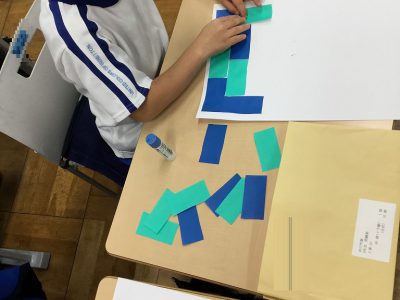 折り紙は、“正方形”であることをもとに、そこから「直角三角形」「長方形」「正方形」を切り分け、“もようづくり”に挑戦しています。