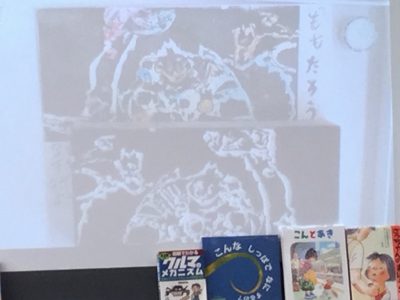 年賀状に絵と文で表しています。中には、消しゴム版画を取り入れ、ダイナミックに読書紹介をしてくれた友だちがいました。彫刻刀で彫った元の消しゴムと、はんこのスタンプ台を使って仕上げた画面を提示して、みんなに知らせてくれています。