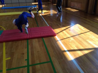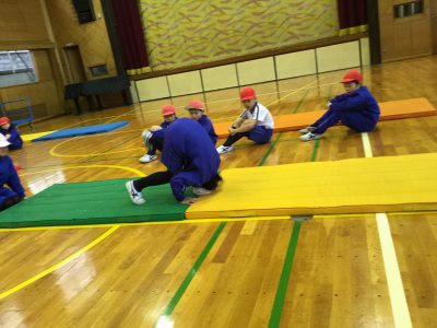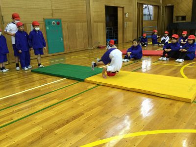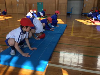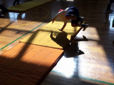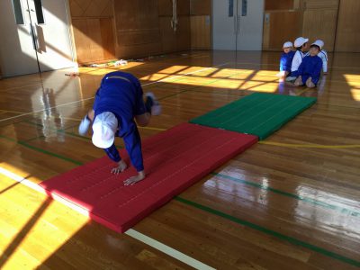 前転では、手の付き方や回るスピード、連続回転を課題に活動しています。