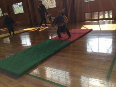 2枚のマットの上を“3回転”にチャレンジ!と、回る工夫を考えています。