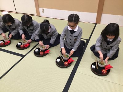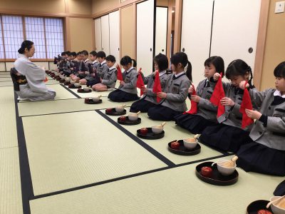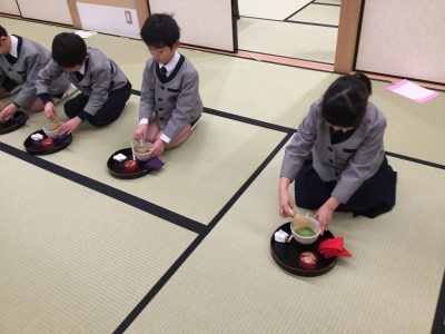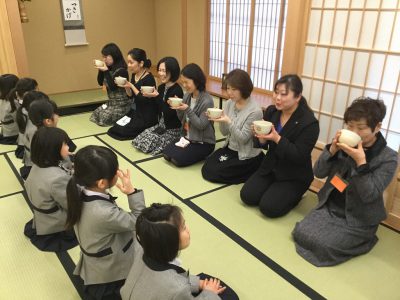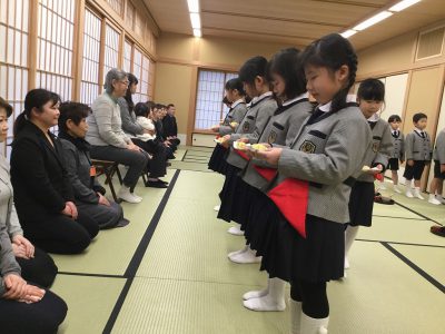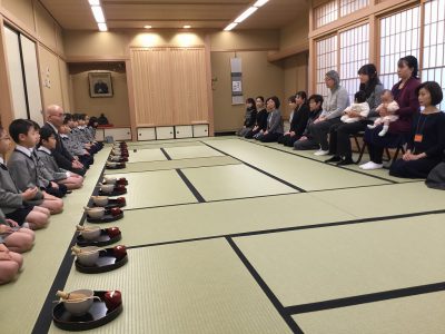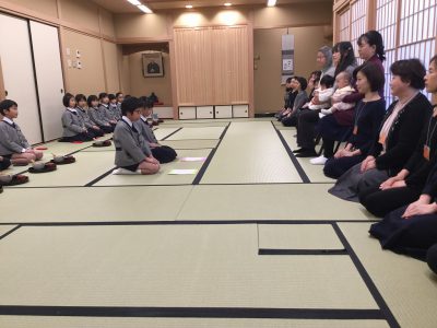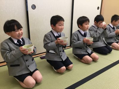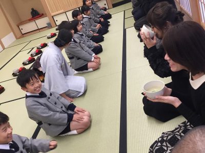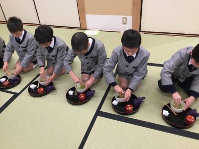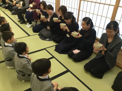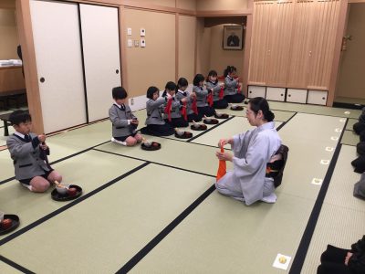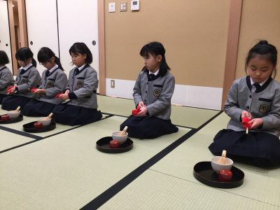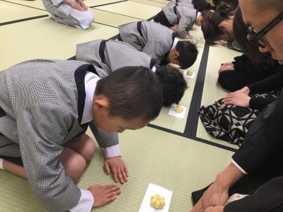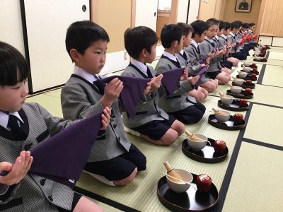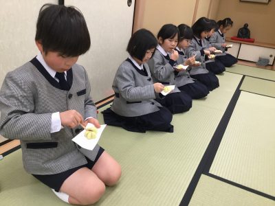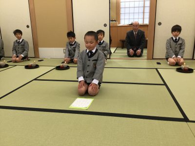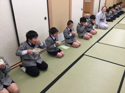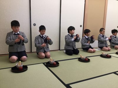 「仏様は、いつも、どんなときも、このお月様のように“まんまる”の心で見ていて下さいますよ」と、校長先生からお話を伺うことができ、2年キッズのまんまるの心で、お点前が始まりました。