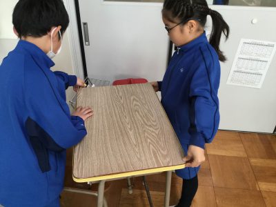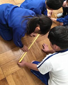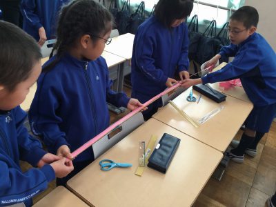 チーム内で協力し、長~い長~いものさしの元を作っていると、