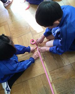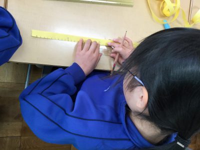 算数の時間に“3m”ほどの長い紙の「ものさし作り」を行いました。