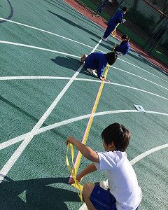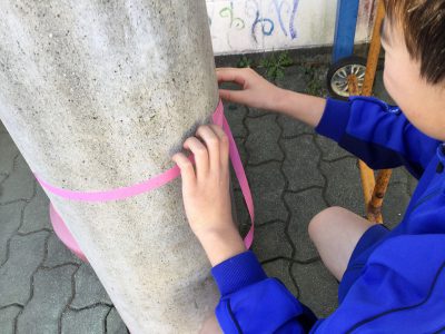 「長い」というメリットと「紙」というメリットをもっているので、グラウンドに出たみんなは、高さのある物のほか、カーブの長さの実測にもチャレンジしてくれました。