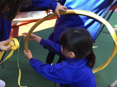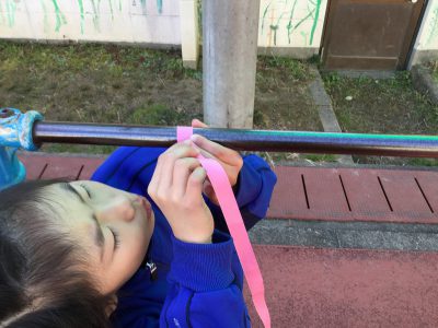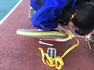 算数のプリントに「一輪車のタイヤの回り」や「鉄棒のにぎるところ」などに単位を付ける問題を出してきました。