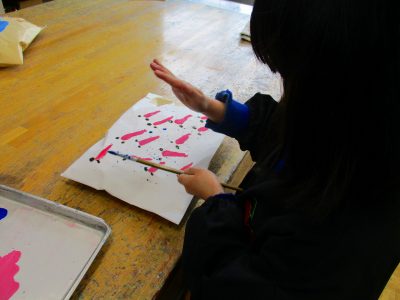みんなが、絵筆で彩色したり絵を描いていたりする中、このように筆をはじいて全面に好きな色を飛ばしていた女子がおりました。