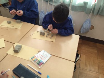 さあ、今日の算数は、ねん土玉と竹ひごを使って、はこの形を作る時間です。