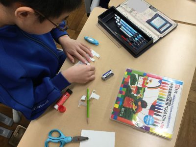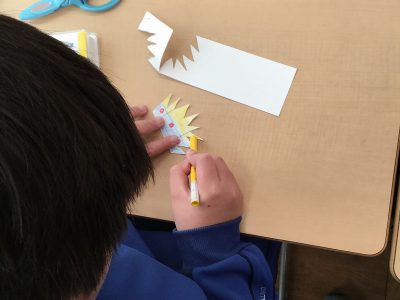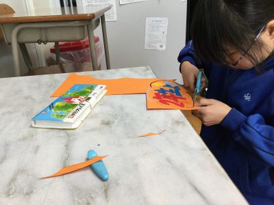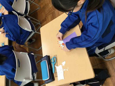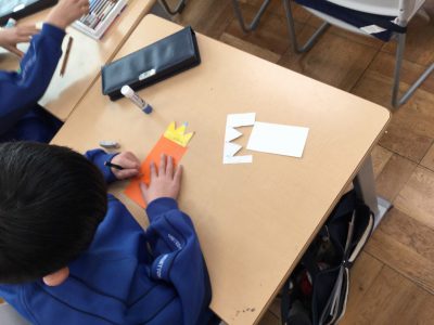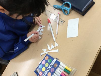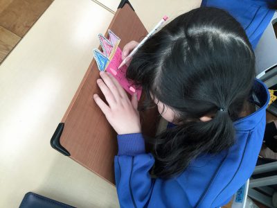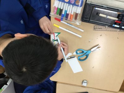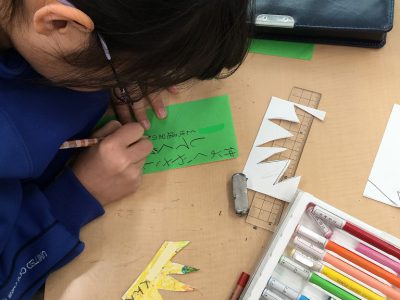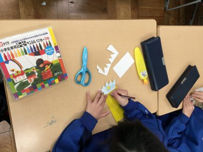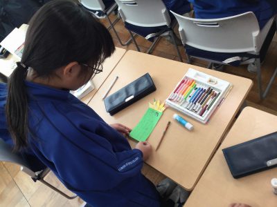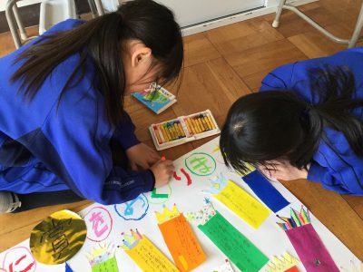 冠ができた人から、班長さんにおくる賞を考え、メッセージを色紙に書いて完成させていきます。