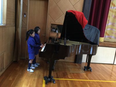 教室のオルガンと体育館のピアノ、タッチがずいぶん違うのですが、いつも通りに落ち着いて弾いています!