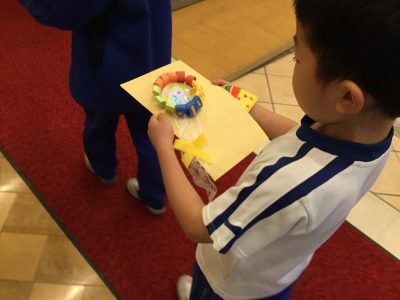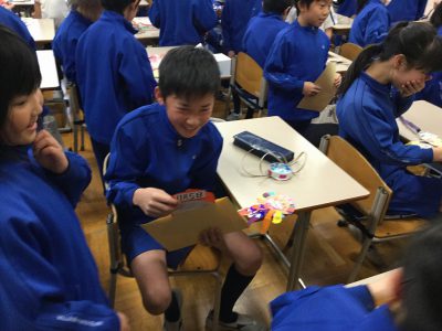 朝一番に、6年生教室へ向かい、2年生が作った“バッジ”を届けに行くところです。