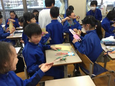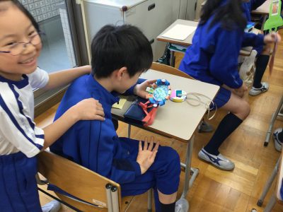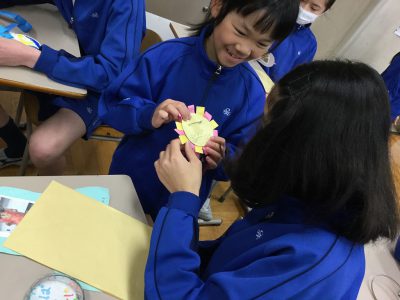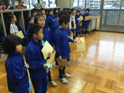 その舞台から登場してくる班長さんが、素敵に輝くアイテムとして、1・2・3年生手作りの飾りをプレゼントしています。