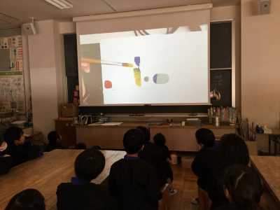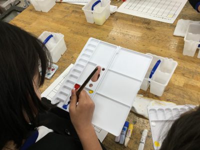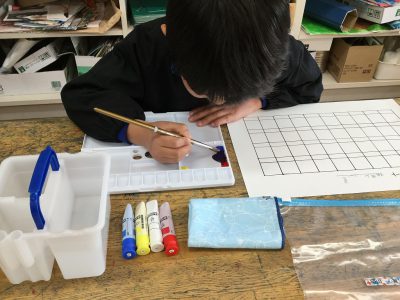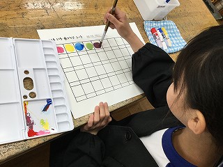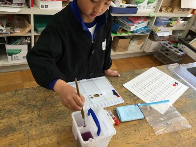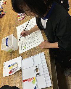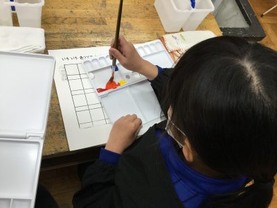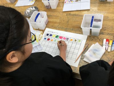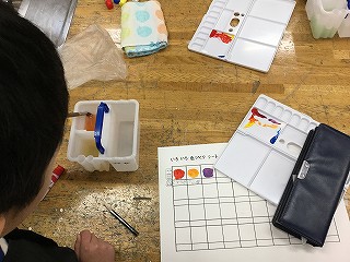 今日の図工では、初めて自分の絵の具セットを使って、絵の具学習を行いました。