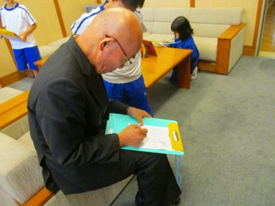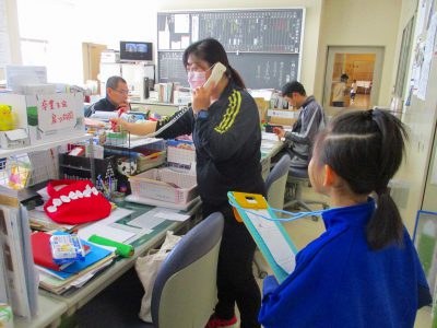 職員室にやってきた2年キッズは、電話の数を調べに回り、ロボットのような印刷機に見入っていました。