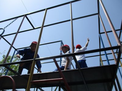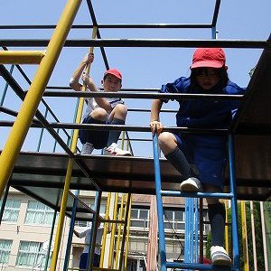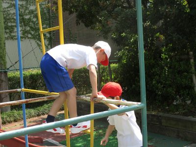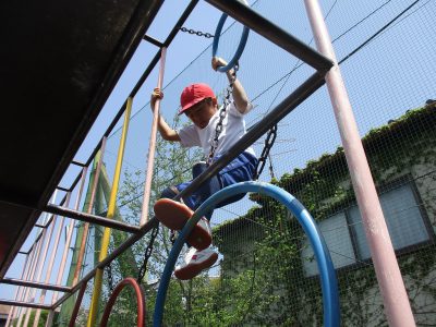 体育では、ジャングルジムの3階(と、文教キッズは呼んでいます)に上る時間を過ごしました。