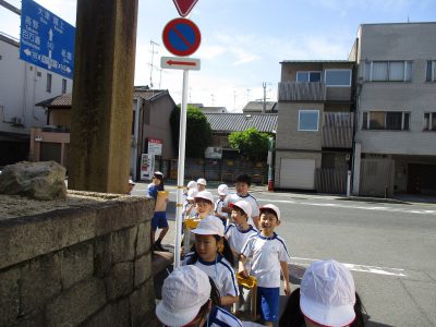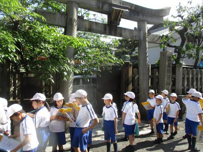 1時間目、社会の学習で、学校周辺のようすを調べに行きました。