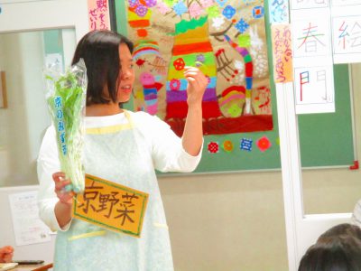 先日の“壬生菜(みぶな)”の続きで、本日のお味噌汁には“水菜(みずな)”が使われていることを、居相先生が知らせに来て下さいました。