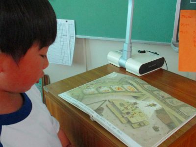 今日の《生活》の時間は、1年生へ学校にあるいろいろな教室を案内する第1弾を行いました。