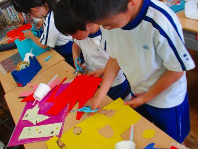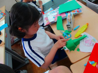 鑑賞会が終わり、後半から、ストローと紙コップを使って動く工作を作りはじめています。