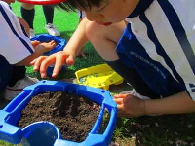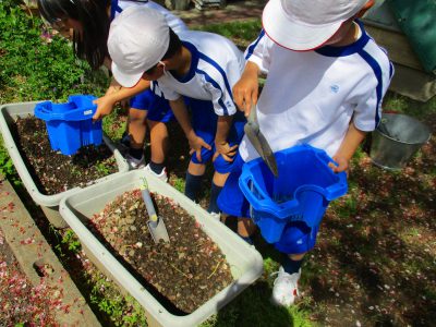 ひと足お先に、晴天の元、2年生が種まきをしました。
