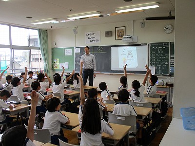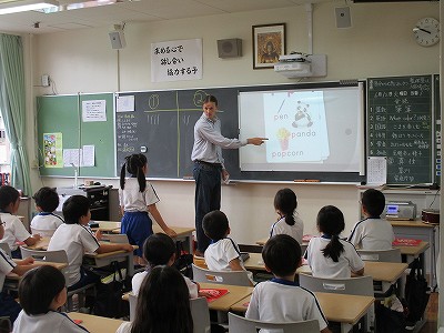 英語は、ゲーム形式で、ポール先生のカードを見ながら発音練習。