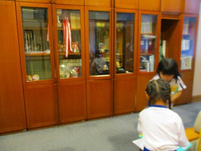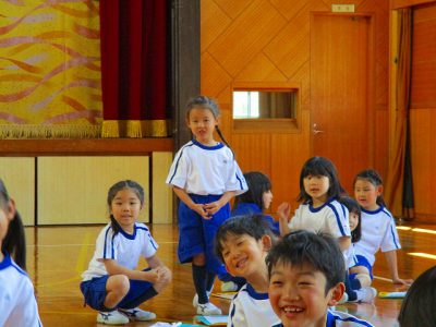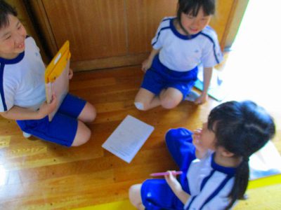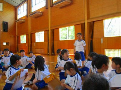 約束した時刻に集まってきたみんなは、グループ毎に教室当てっこの問題を出したり、「好きな教室はどこ?」と1年生に質問をするなどして、全員が揃うのを待っていてくれました。