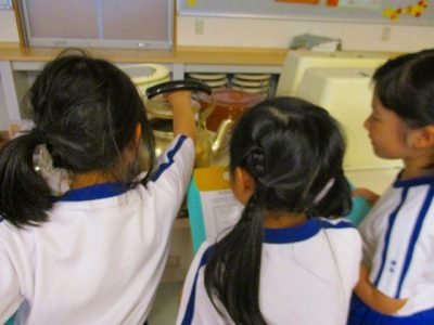 家庭科室へ行くと、大きなやかんが並んでいました。