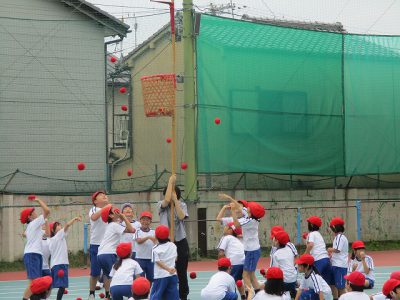 玉入れの練習。今日の勝利は、赤組でした!