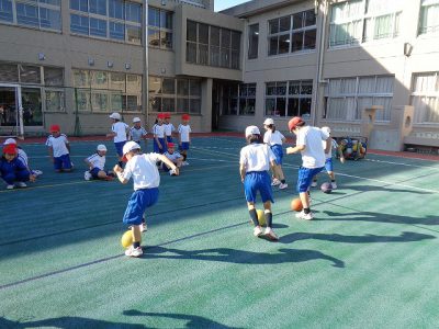 足をボールに乗せたり、ボールをころがしたり、ドリブルしたり……