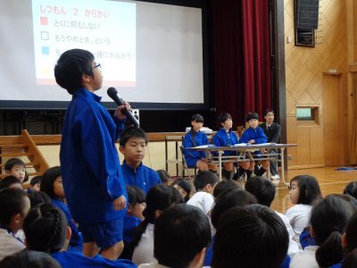 文教キッズが自分逹の学校生活を見つめ直す大事な行事「月影集会」。第一部の児童会総会では、自分の意見を発表する人がたくさんいて、積極的に集会に参加できていました。
