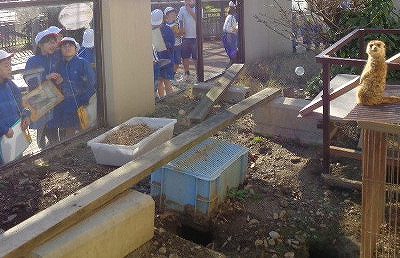 ミーアキャットの“ひなたぼっこ”を見入っているみんな。カメラ目線のミーアキャット、心の声が聞こえてきそうです。