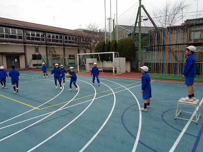 体育は、ポートボールのルールを覚えながら、チームで練習をしました。