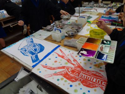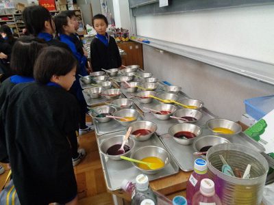 「染料」が器に入っていて、仕上げの色づけに使うことを聞いた3年生。