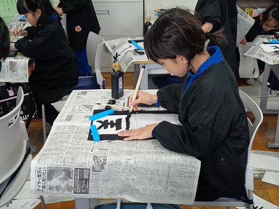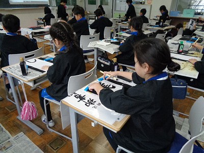 6時間目は習字で、画仙紙に「美しい心」を書きました。