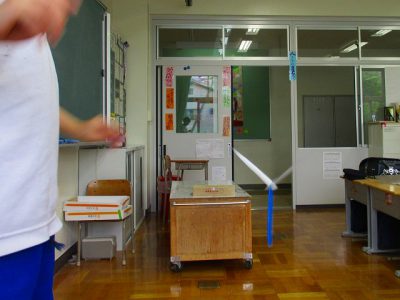 午後3時過ぎの校庭の風は少し横向きのため、軽い“折り紙たね”は、あおられる感じで、ひらひらは難しいようでした。