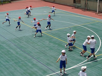 日本の誇る、陸上400mリレー選手の流れるような見事なバトンパスを目指して、繰り返し練習を頑張りました。