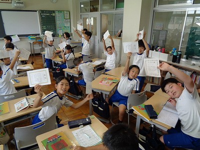 昼休み直前に、児童会の6年生がお知らせに来ました。「この前の『もくそうじキャンペーン』で、1週間、黙掃除を続けた人の賞状ができあがりました。これからも、黙掃除をがんばってください。4年生は、とっても多くて賞状をつくるのが大変でした~。」とのこと。