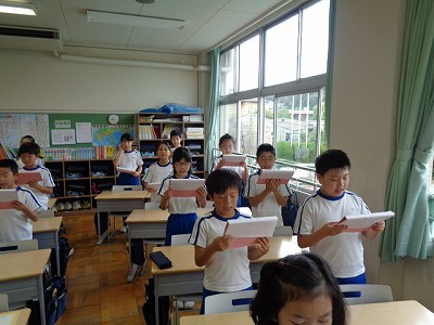 国語授業では、簡易点字機を使って、自己紹介カードをつくりました。先週、練習して、今日は本番! …ですが、難しい…。教科書の点字表をみながら、点字を打つのですが、用紙の裏側から打つので、左右逆に打たなければなりません。これが難しい!「わたしは○○です。よろしくね。」だけなのですが…、皆、真剣に、悪戦苦闘しました。街中で見かける点字への関心が深まり、点字がすらすらと読めるようになったら…格好いいですね!期待しています。