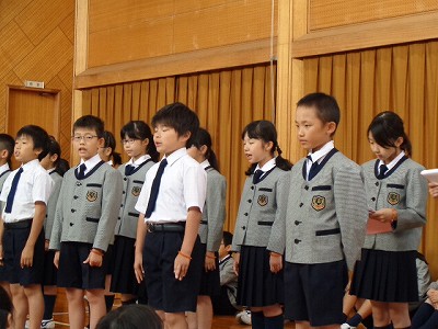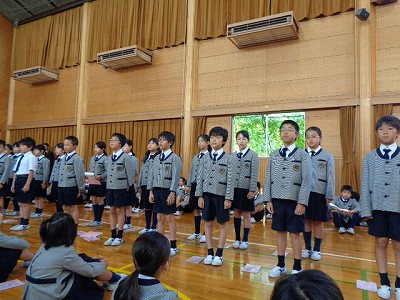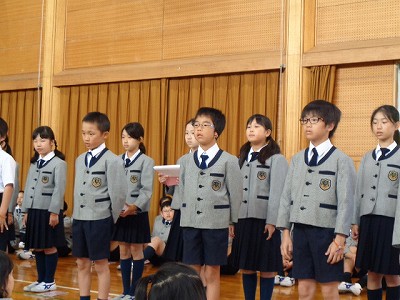 「秋晴れ」の晴天のもと、清々しい気持ちで朝の礼拝に参加することから、一日が始まりました。礼拝の後の音読発表は、中学年、4年生の出番です!