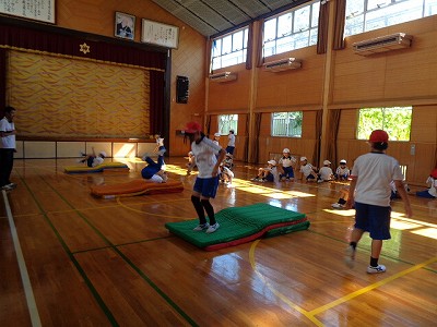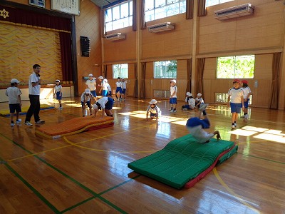 マットを2枚、3枚と増やして、軽やかな前転練習を行いました。回った後に「すたっ」と立ち上がることも意識して練習しました。