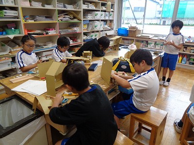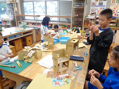 今週は、3日しか登校日がないので、大好きな図工も1時間だけとなりました。この1時間を大切に!今週もビーンズハウス製作を進めます。「二階部分が難しい~~」などとうなりながら創りあげていきます。苦労した分、心に残る作品になると確信しています。