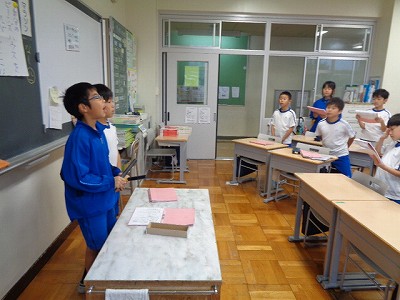 1時間目の漢字テストのあと、図書室に行きました。図書の貸し出し・返却を行う前に、図書整理をするのも、すっかり手慣れています。たった3分間の実施ですが、有るべきところに戻す作業をとおして、図書室の図書の並び方や、「こんなところに、こんな本があったのか」と今まで興味を持てなかった本に気づき、本の世界を広げてほしい、というのもねらいの一つです。図書が揃うのは気持ちがよい、と感じてくれているのも伝わってきます。