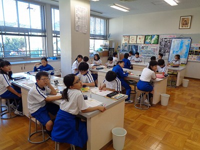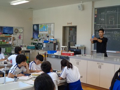 理科授業では「ものの温度と体積」学習です。今日は「冷やすと、どうなるのか」ということを実験で確かめてから、まとめ学習を行いました。頭で分かっていることも、実際に五感で確かめると、子ども達は大きく感動しています。体感することの大切さが伝わってきました。