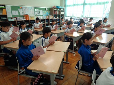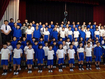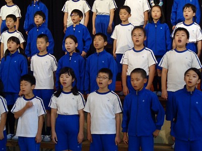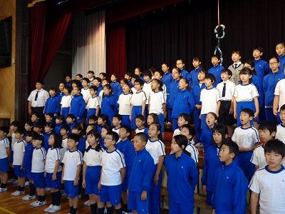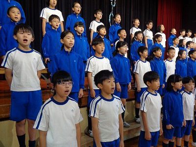 朝ねっこタイムから、3学年合同での合唱練習です。日直さんの今日の目標は「さわやかに歌おう」でした。朝一番ですが、勢いよく歌う2年生に負けじと、口をしっかり開けて、清々しい声で目標通りさわやかに歌うことができました。