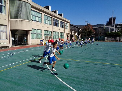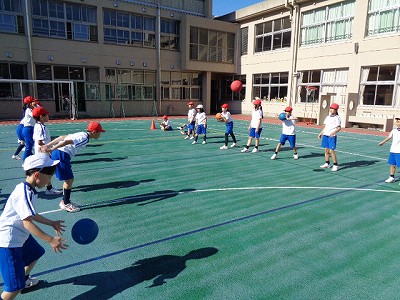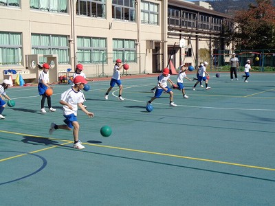 今日は、快晴のもと、体育授業では「ポートボール」学習開始です。まずは、基本のパス練習やドリブル練習からスタートです。トラベリングにならないよう、ドリブルしたり、パスしたりするのは、案外難しいものです。自分ではちゃんと出来ている、と思っているけれど…。まだまだ、これから練習です。