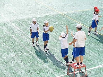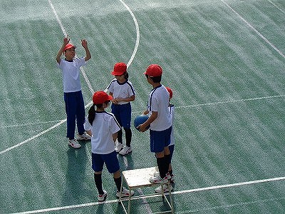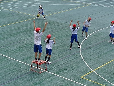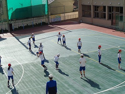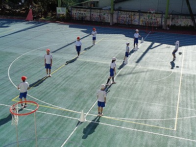 ポートボール学習では、グループ毎にパスをつなぐ練習です。