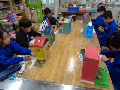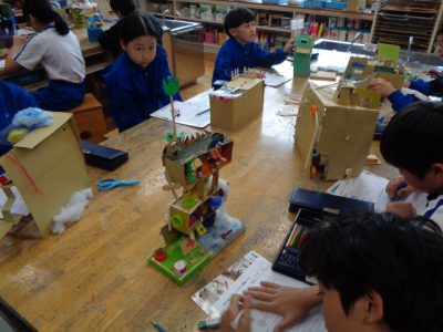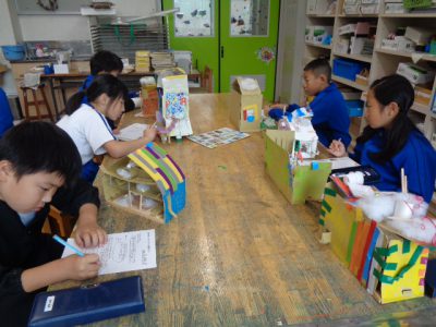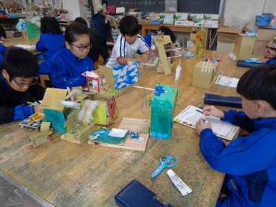 今日の図工科授業は、4週間にもわたり取り組んできた「ビーンズハウス」の完成を迎え