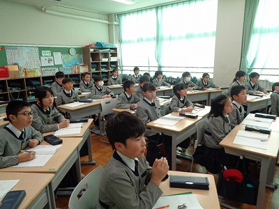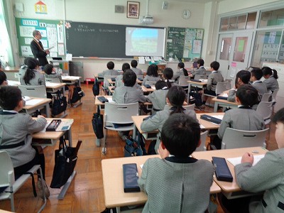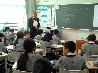 1時間目は、周豊先生による「月かげ授業」です。勢至丸さま(法然上人の子ども時代)のエピソードから、望まれる子どもの姿について学びました。「みんなが喜ぶ顔がたくさん見られるようにする」ためには、「仕返ししない」という具体的な行動目標を教えていただきました。みんなで決めた4年生3学期目標「いつでも笑顔で支え合い、すすんで自ら行動しよう」を見て、「これこそ『智慧(ちえ)のある子』の姿です。法然上人様の願いであり、文教小学校の願う子どもです」と言ってくださいました。