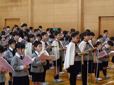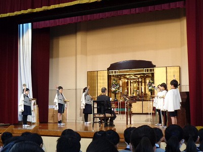 先週、メンバーは休み時間も遊ばずに練習してきました。見ているこちらは、ドキドキしましたが、とても落ち着いた様子で、役割を立派に果たし終えました。役を終えて、自分の列に戻る時にお互い目が合って、にっこり。瞳の中にVサインが見えました。