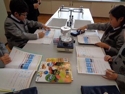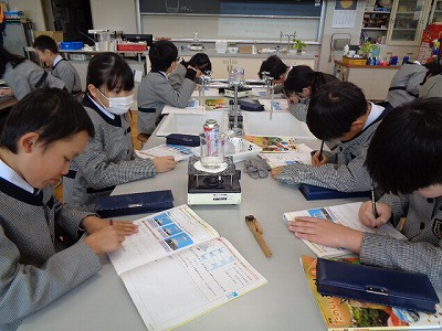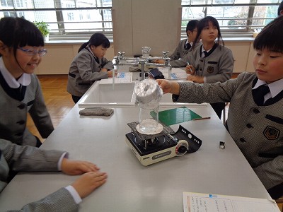 理科授業は「温度と水の変化」単元の実験です。変化を覚えるのではなく、体験して、確かめて体得してほしいと思います。実験で分かったことを自分なりにまとめておくことも大切な学習です。気づいた学びを文字で表すことは、これからも大切な力につながります。